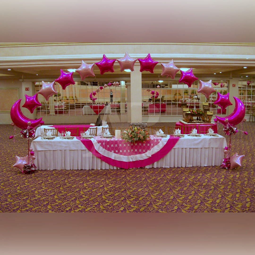 - Arco de globos metálicos de estrella rellenos de helio y 2 torres con punta a elegir: Punta Luna o Estrella